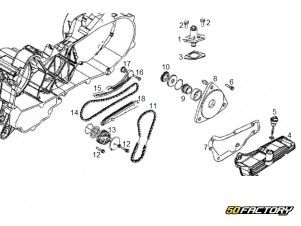 Exploded view of the camshaft and the crankshaft of the scooter engine 50cm3 4 time for Piaggio, Fly, Typhoon, Zip, Vespa,Lx,S, Primavera 50 cm3 4 time and many other models. Easily find the spare parts for your scooter thanks to the diagram of the camshaft and the crankshaft for your 50cc 4 time type scooter engine Piaggio AC cooling par air.